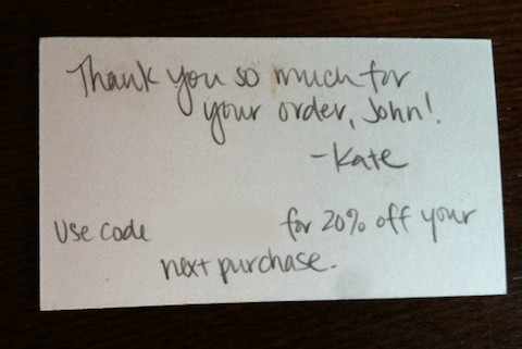 Plain padded envelope, but with special hand drawn doodles - this isn't an Amazon package - it's just what I would expect from my hand made purchaseThe full contents of the package - wow, very nice looking presentation and look, a business card. Not that innovative, but strangely rare.And what's this? A free sample of another product - now I want to buy some of those note cardsOn the back of the business card Katie has hand written a special offer for my next purchase - I'm feeling pretty good about this and I haven't even opened the actual productOn to the purchase - I bought this for myself, but it's like getting a gift. Note the added branding with the sticker.The product revealed and note the subtle band of branding on the actual product - how will I ever forget Katie Blair Designs now.The actual product, found online, is what attracted me, but it was the overall experience that has me referring this business and wanting to buy more because I have a lot of, hmm, brilliant ideas