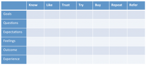 Create a row above for each stage of the Duct Tape Marketing Hourglass™ begin with Know, Like, and Trust then continuing into Try and Buy and ending with Repeat and Refer. This framework will allow you to answer the questions about the customer experience and envision how they will progress from one step of the Marketing Hourglass to the next. Repeat the process for each of your interactions.
