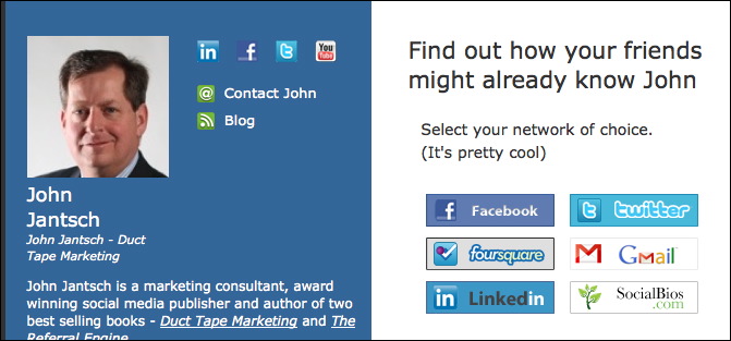 Social graph – A new service called SocialBios – allows visitors to your page to see who they might know in your Facebook, LinkedIn, Foursquare, GMail or Twitter worlds. This can be a great way to facilitate referrals and make connections easier. Try it out with me here – SocialBio for John Jantsch